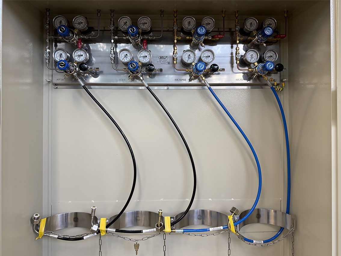 Компания "Мониторинг Вентиль и Фитинг" оправила покупателю большую разрядную рампу, предназначенную для подсоединения четырех баллонов и четырех внешних источников с рабочим газом, а также выдачи газа потребителю под заданным давлением.